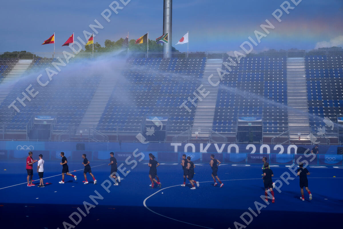 Members of the Canadian men's field hockey team run beneath sprinklers during a training session at Oi Hockey Stadium ahead of the the 2020 Summer Olympics, Thursday, July 22, 2021, in Tokyo, Japan. (AP Photo/John Locher)
