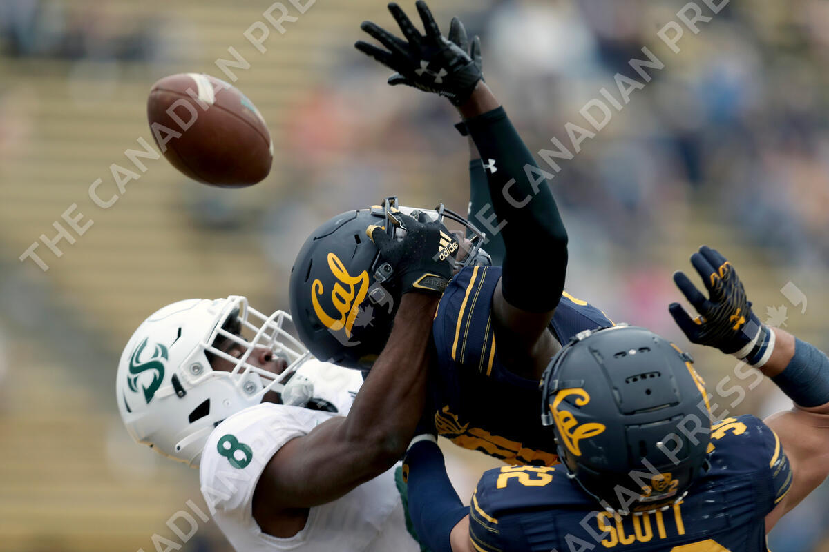 California cornerback Collin Gamble, center, and cornerback Daniel Scott (32) break up a pass against Sacramento State wide receiver Jared Gipson (8) during the second half of an NCAA college football game on Saturday, Sept. 18, 2021, in Berkeley, Calif. (AP Photo/Jed Jacobsohn)