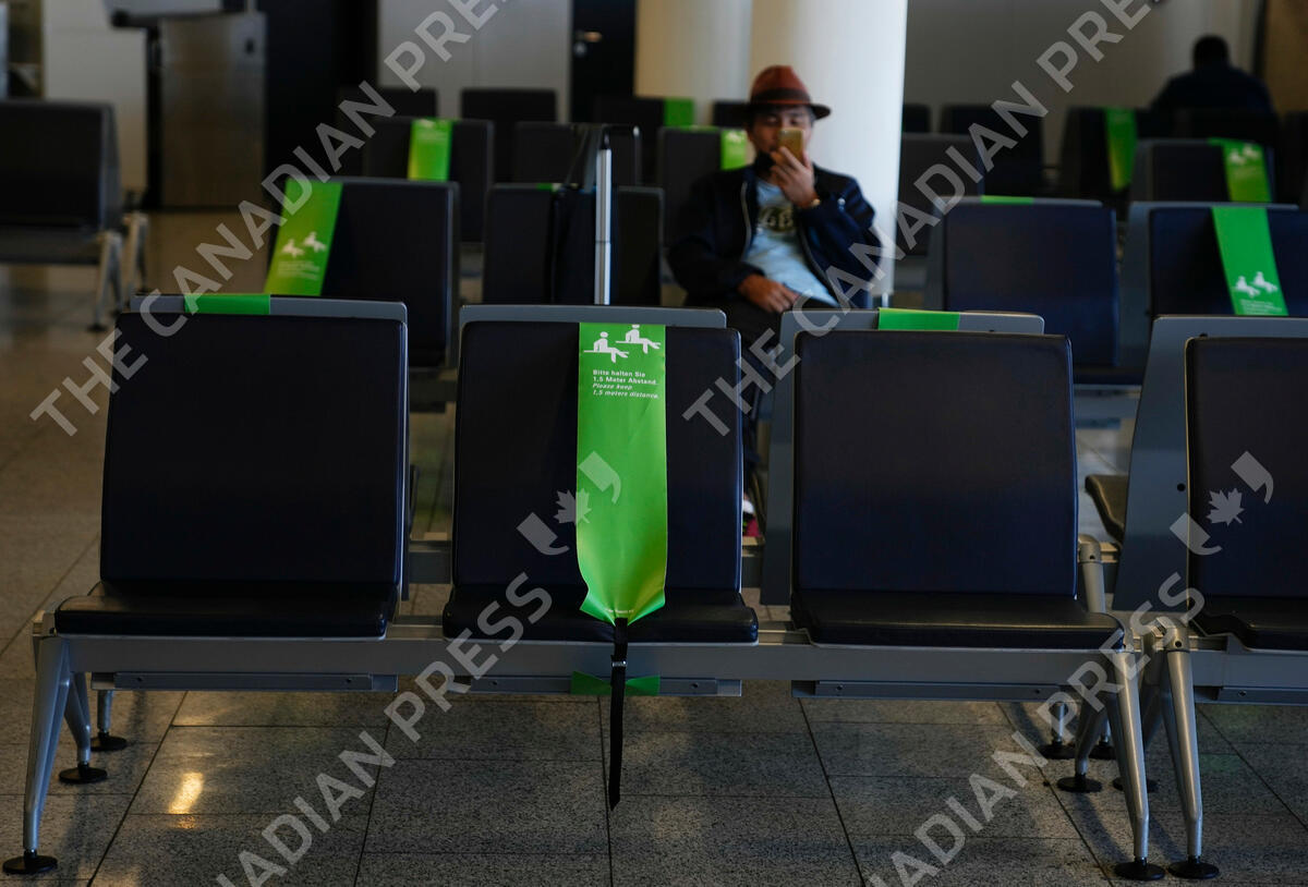 A passenger looks at his phone in Frankfurt, Germany on Sunday, July 18, 2021. (AP Photo/Natacha Pisarenko)