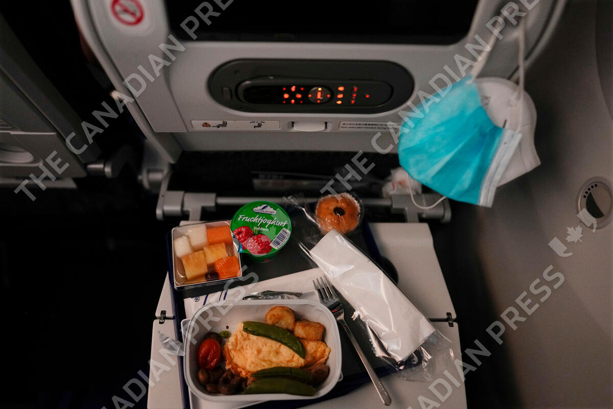 A breakfast sits in front of face masks on a tray table during a flight to Tokyo from Frankfurt, Germany, Monday, July 19, 2021. (AP Photo/Natacha Pisarenko)