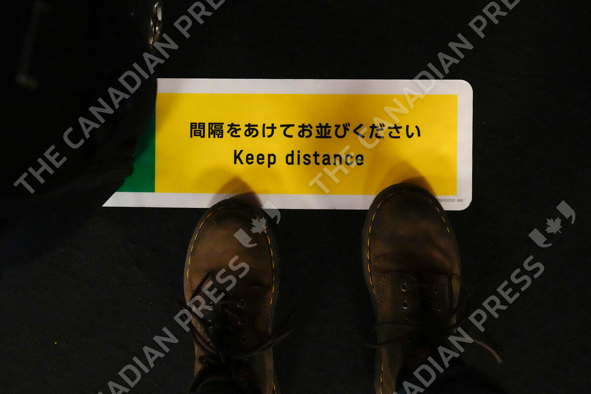 Associated Press photographer stands on a social distance marker while waiting to get her 2020 Summer Olympics credential validated before leaving Haneda Airport in Tokyo, Monday, July 19, 2021. (AP Photo/Natacha Pisarenko)