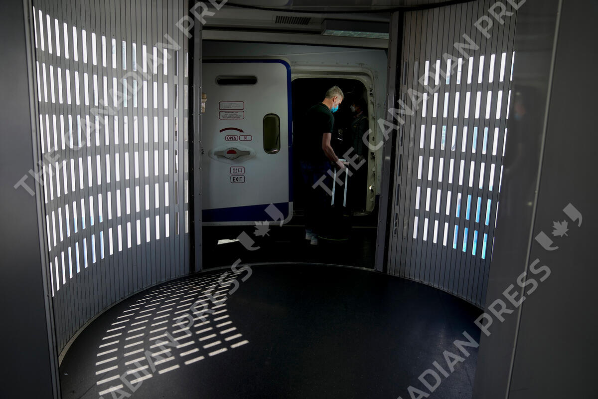 A passenger boards a flight from Frankfurt, Germany to Tokyo Sunday, July 18, 2021. (AP Photo/Natacha Pisarenko)