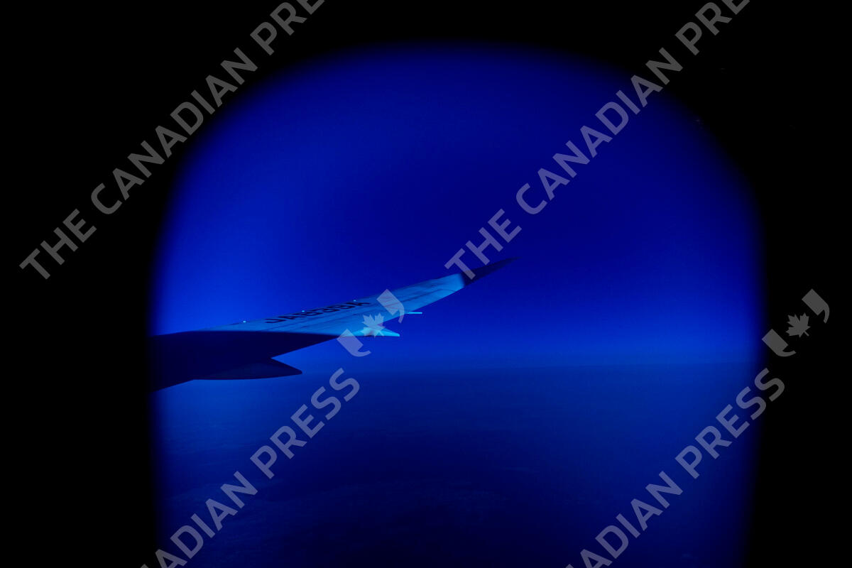 A wing of a plane is seen through a window on a flight Monday, July 19, 2021, from Frankfurt, Germany to Tokyo ahead of the 2020 Summer Olympics. (AP Photo/Natacha Pisarenko)