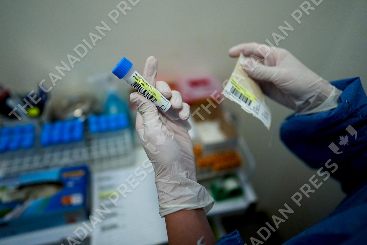 A heath worker is about to take a sample in Buenos Aires, Argentina, Friday, July 16, 2021, for the second required COVID-19 test to travel to Tokyo to work at the 2020 Summer Olympics. (AP Photo/Natacha Pisarenko)