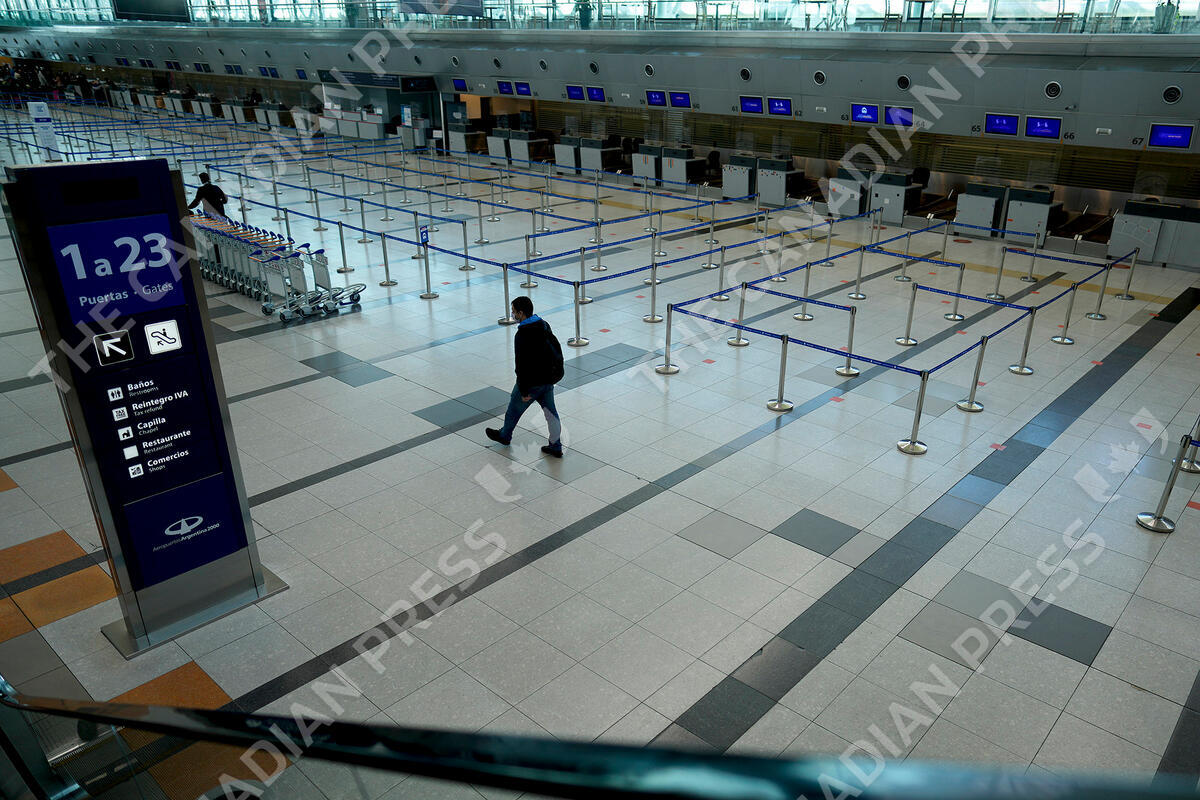 A man walks across the airport in Buenos Aires, Argentina, Saturday, July 17, 2021. (AP Photo/Natacha Pisarenko)