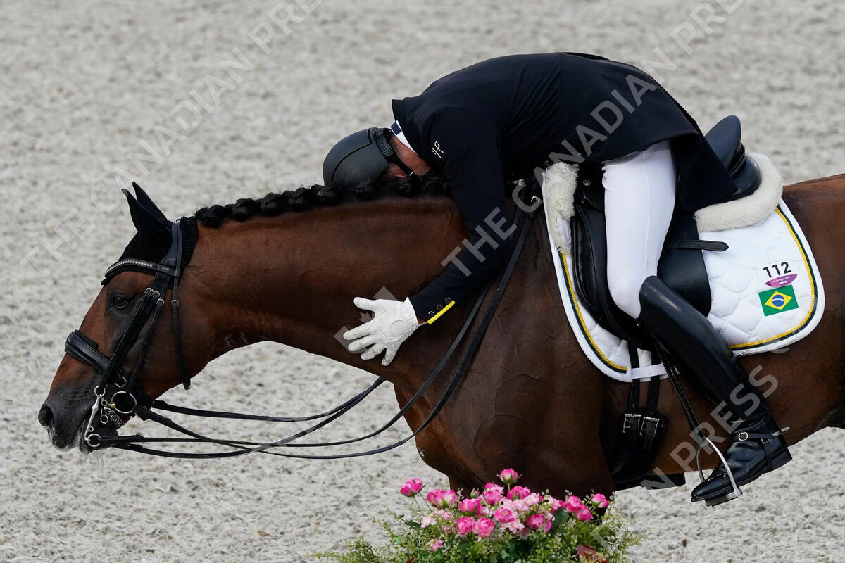 Brazil's Joao Victor Marcari Oliva, hugs Escorial Horsecampline as he celebrates after competing during the dressage Grand Prix competition at Equestrian Park the 2020 Summer Olympics, Saturday, July 24, 2021, in Tokyo, Japan. (AP Photo/Carolyn Kaster)