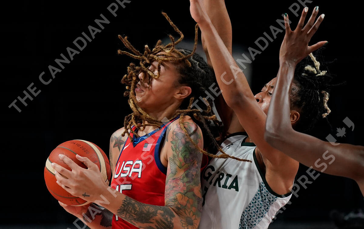United States' Brittney Griner (15), left, attempts to shoot past Nigeria's Pallas Kunaiyi-Akpanah (3), right, during women's basketball preliminary round game at the 2020 Summer Olympics, Tuesday, July 27, 2021, in Saitama, Japan. (AP Photo/Eric Gay)