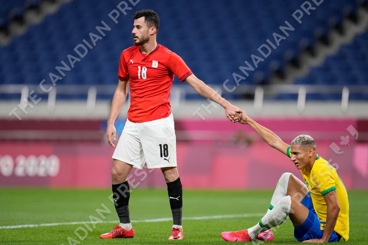 Egypt's Mahmoud El Wench, left, helps Brazil's Richarlison get up during a men's quarterfinal soccer match at the 2020 Summer Olympics, Saturday, July 31, 2021, in Saitama, Japan. (AP Photo/Silvia Izquierdo)