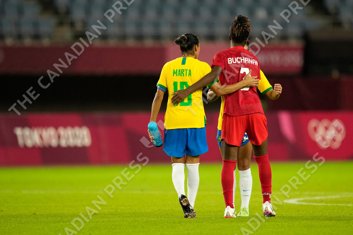Canada's Kadeisha Buchanan, right, embraces Brazil's Marta at the end of a women's quarterfinal soccer match at the 2020 Summer Olympics, Friday, July 30, 2021, in Rifu, Japan. Canada won 4-3 in a penalty shootout. (AP Photo/Andre Penner)
