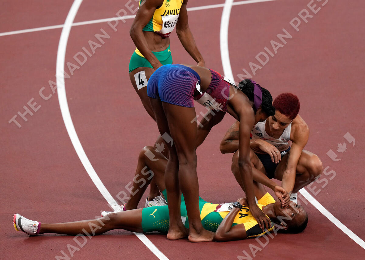 Stephenie Mcpherson, of Jamaica reacts as she is helped from the track after the final of women's 400-meters at the 2020 Summer Olympics, Friday, Aug. 6, 2021, in Tokyo, Japan. (AP Photo/Francisco Seco)