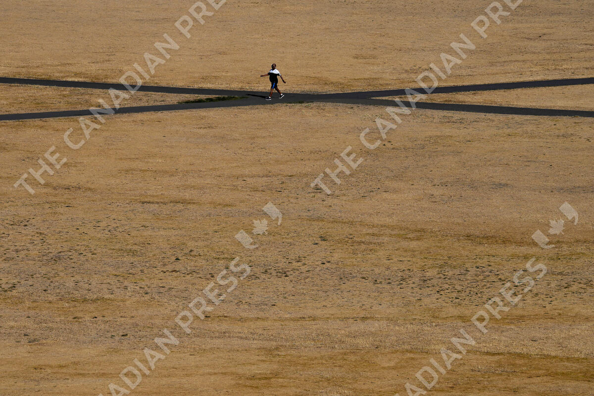A man walks along a road through dry and sun burnt grass in Greenwich Park in London, Tuesday, Aug. 9, 2022. Britain is braced for another heatwave that will last longer than July's record-breaking hot spell, with highs of up to 35 C expected next week. (AP Photo/Frank Augstein)