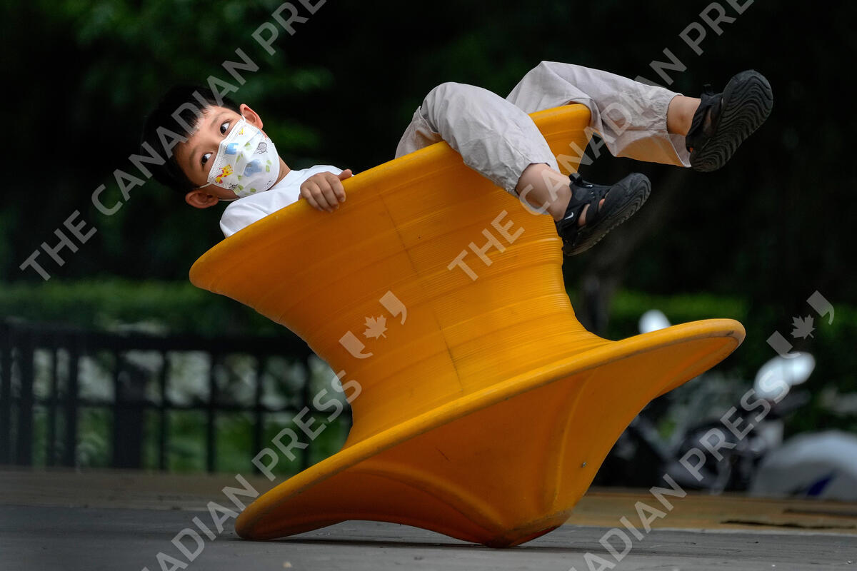 A kid wearing a face mask plays on a balancing chair at a green space in Beijing, Monday, Aug. 8, 2022. (AP Photo/Andy Wong)