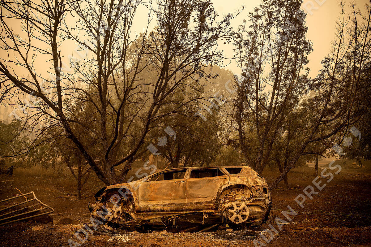 A scorched vehicle rests sits next to a driveway as the McKinney Fire burns in Klamath National Forest, Calif., on Sunday, July 31, 2022. (AP Photo/Noah Berger)
