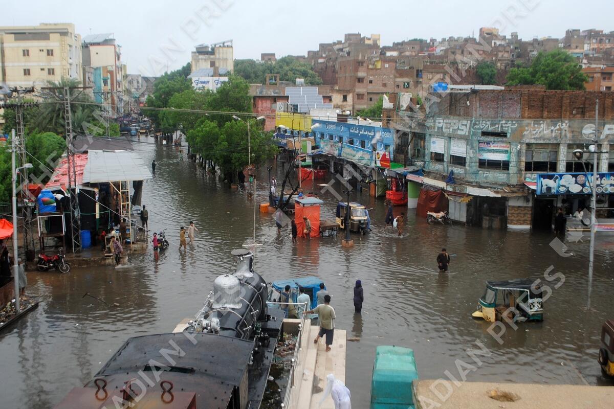 People navigate through flooded roads after heavy monsoon rains, in Hyderabad, Pakistan, Wednesday, Aug. 24, 2022. (AP Photo/Pervez Masih)