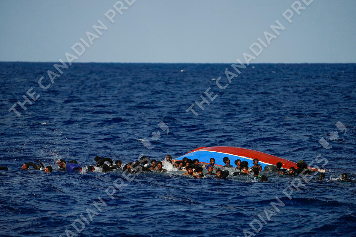 Migrants swim next to their overturned wooden boat during a rescue operation by Spanish NGO Open Arms at south of the Italian Lampedusa island at the Mediterranean sea, Thursday, Aug. 11, 2022. Forty migrants from Eritrea and Sudan, two children and one woman, were rescued by NGO Open Arms crew members and Italian coast guard after their boat overturned and started to sink. (AP Photo/Francisco Seco)