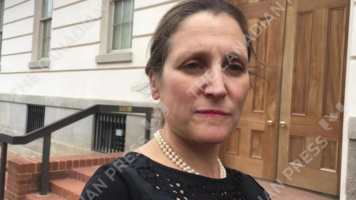 Foreign Affairs Minister Chrystia Freeland speaks to reporters in Washington on Tuesday, April 24, 2018. Freeland is in Washington for NAFTA talks. SOUNDBITE: Chrystia Freeland, Foreign Affairs Minister PLACELINE: Washington CREDIT: The Canadian Press LANGUAGE: English, French