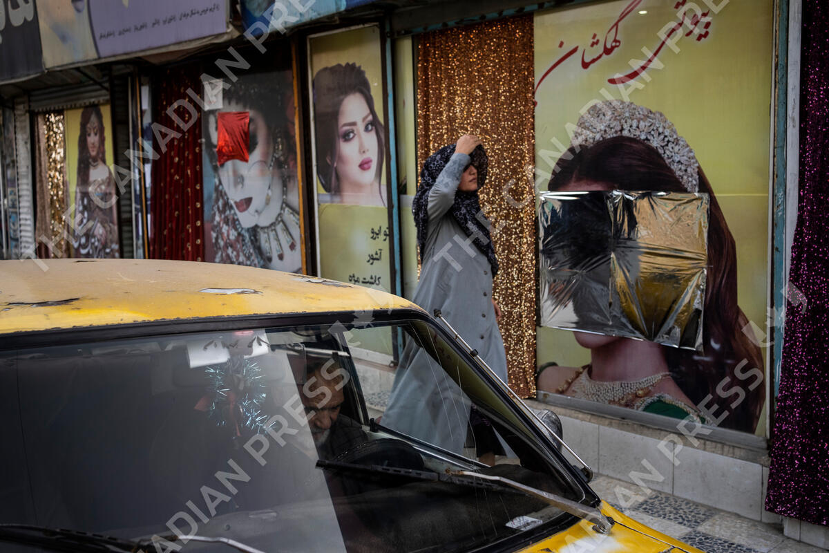 A woman walks past beauty salons with window decorations which have been defaced in Kabul, Afghanistan, Sunday, Sept. 12, 2021. Since the Taliban gained control of Kabul, several images depicting women outside beauty salons have been removed or covered up. (AP Photo/Bernat Armangue)