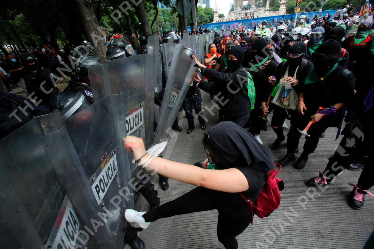 Women clash with the police during an abortion-rights demonstration on the Day for Decriminalization of Abortion, in Mexico City, Tuesday, Sept. 28, 2021. (AP Photo/Ginnette Riquelme)