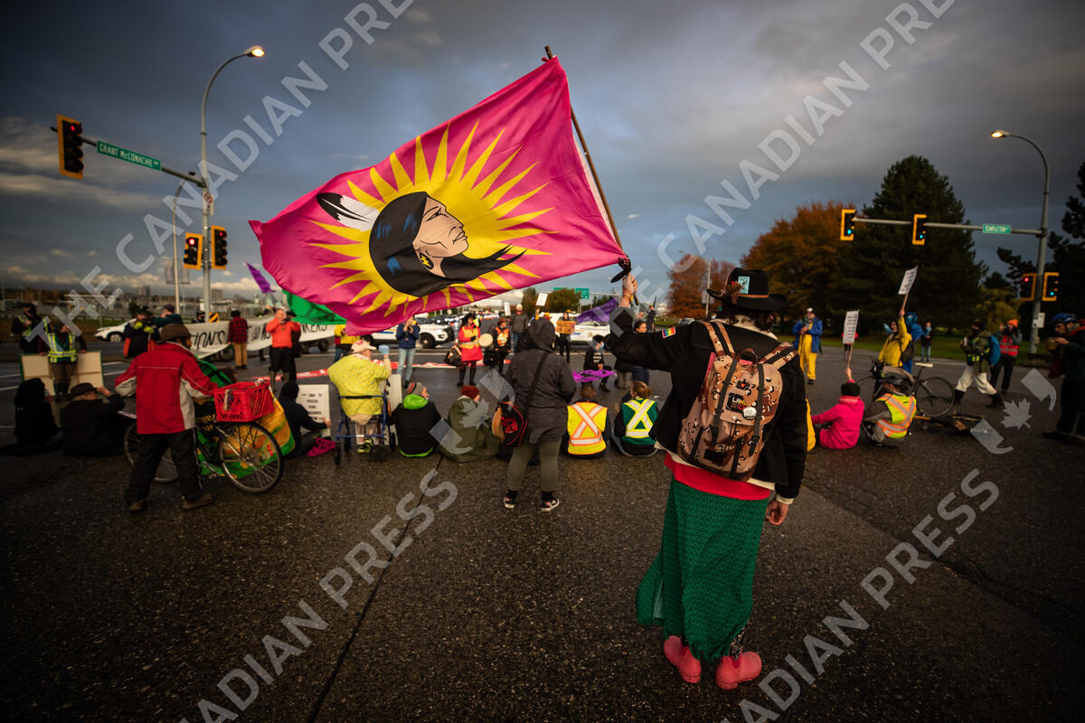 A person holds a women's warrior flag as the environmental activist group Extinction Rebellion blocks the main road used to access Vancouver International Airport, in Richmond, B.C., Monday, Oct. 25, 2021. More than a dozen people were arrested and traffic to and from the airport was diverted due to the protest which was part of the group's two week "October Rebellion" action. THE CANADIAN PRESS/Darryl Dyck