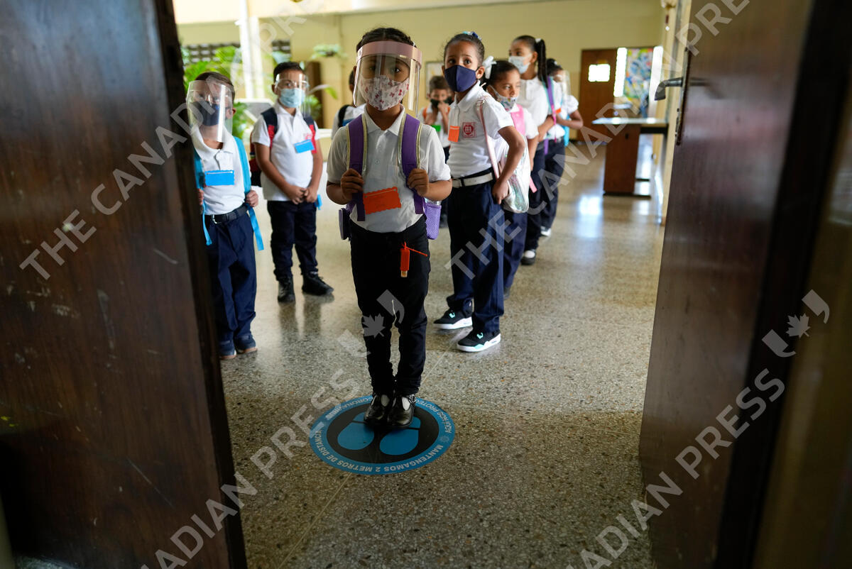 Students wait for instructions to enter their classroom on the first day back to in-person school during an easing of the COVID-19 pandemic restrictions, at a public school in Caracas, Venezuela, Monday, Oct. 25, 2021. (AP Photo/Ariana Cubillos)