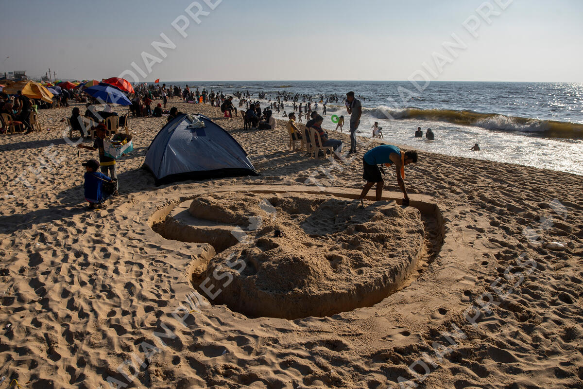 A Palestinian man works on a sand shape of heart on the beach of Gaza City, Friday, July 2, 2021. (AP Photo/Khalil Hamra)