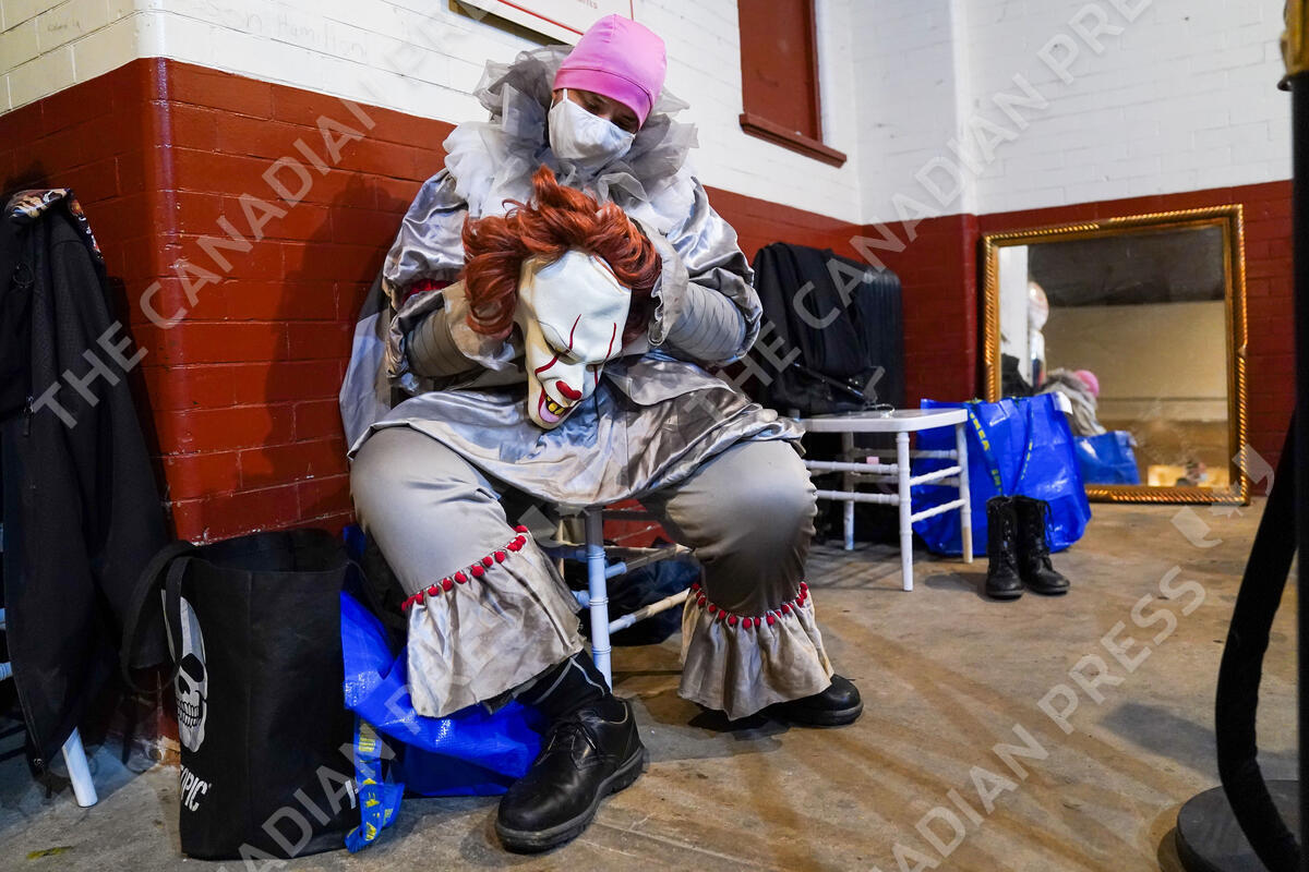 Actor Matthew Laird fixes the wig on his Pennywise-inspired mask before the start of Legends of Horror at Casa Loma, in Toronto, Tuesday, Oct. 26, 2021. THE CANADIAN PRESS/Evan Buhler