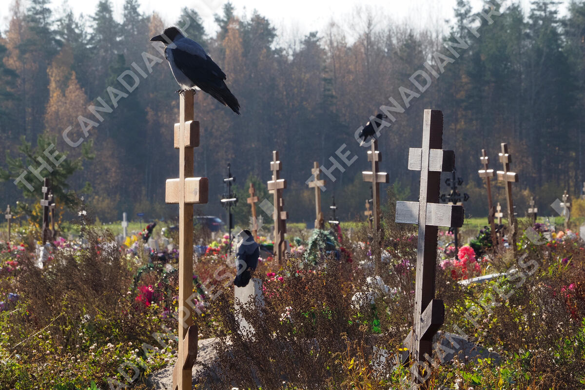 Crows sit on grave crosses in the section of a cemetery reserved for coronavirus victims in Kolpino, outside St. Petersburg, Russia, Tuesday, Oct. 12, 2021. Russia hit another record of daily coronavirus deaths Tuesday as the country struggled with a rapid surge of infections and lagging vaccination rates, but authorities have been adamant that there would be no new national lockdown. (AP Photo/Dmitri Lovetsky)