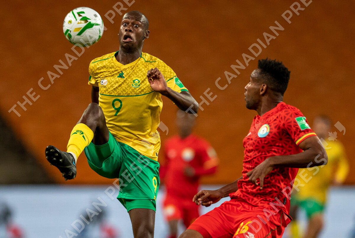South Africa's Evidence Makgopa, left, is challenged by Ethiopia's Shemelese Bekele Godo during the World Cup 2022 group G qualifying soccer match between South Africa and Ethiopia at Soccer City stadium in Johannesburg, South Africa, Tuesday, Oct. 12, 2021. (AP Photo/Themba Hadebe)