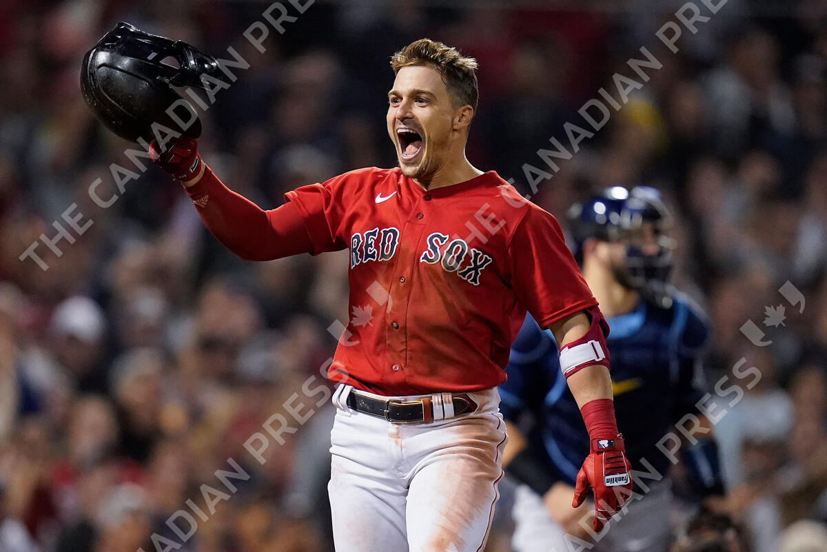 Boston Red Sox Enrique Hernandez, reacts after hitting a sacrifice fly ball to score Danny Santana to beat the Tampa Bay Rays in the ninth inning during Game 4 of a baseball American League Division Series, Monday, Oct. 11, 2021, in Boston. The Red Sox won 6-5. (AP Photo/Charles Krupa)