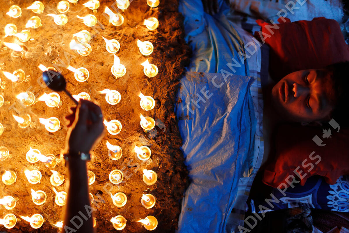 A man lies still as devotees light oil lamps over his body as part of rituals to celebrate the tenth and final day of Dashain festival in Bhaktapur, Nepal, Friday, Oct. 15, 2021. The festival commemorates the slaying of a demon king by Hindu goddess Durga, marking the victory of good over evil. (AP Photo/Niranjan Shrestha)