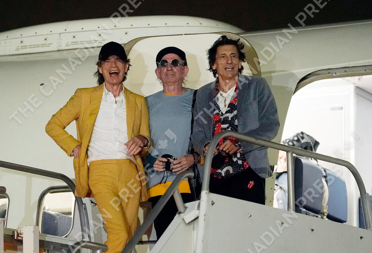 Mick Jagger, left, Keith Richards, center, and Ron Wood of The Rolling Stones arrive at Hollywood Burbank Airport in Burbank, Calif., Monday, Oct. 11, 2021, ahead of their shows this week at SoFi Stadium in Inglewood, Calif., for their "NO FILTER" tour. (AP Photo/Chris Pizzello)