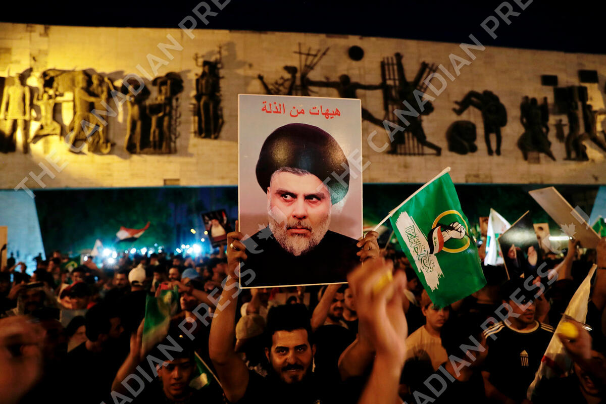 Followers of Shiite cleric Muqtada al-Sadr celebrate holding his posters, after the announcement of the results of the parliamentary elections in Tahrir Square, Baghdad, Iraq, Monday, Oct. 11, 2021. Iraq's Independent High Electoral Commission (IHEC) announced the parliamentary results of the November 10 vote which suggested that al-Sadr is the current front-runner with initial results coming from several Iraqi provinces. (AP Photo/Khalid Mohammed)