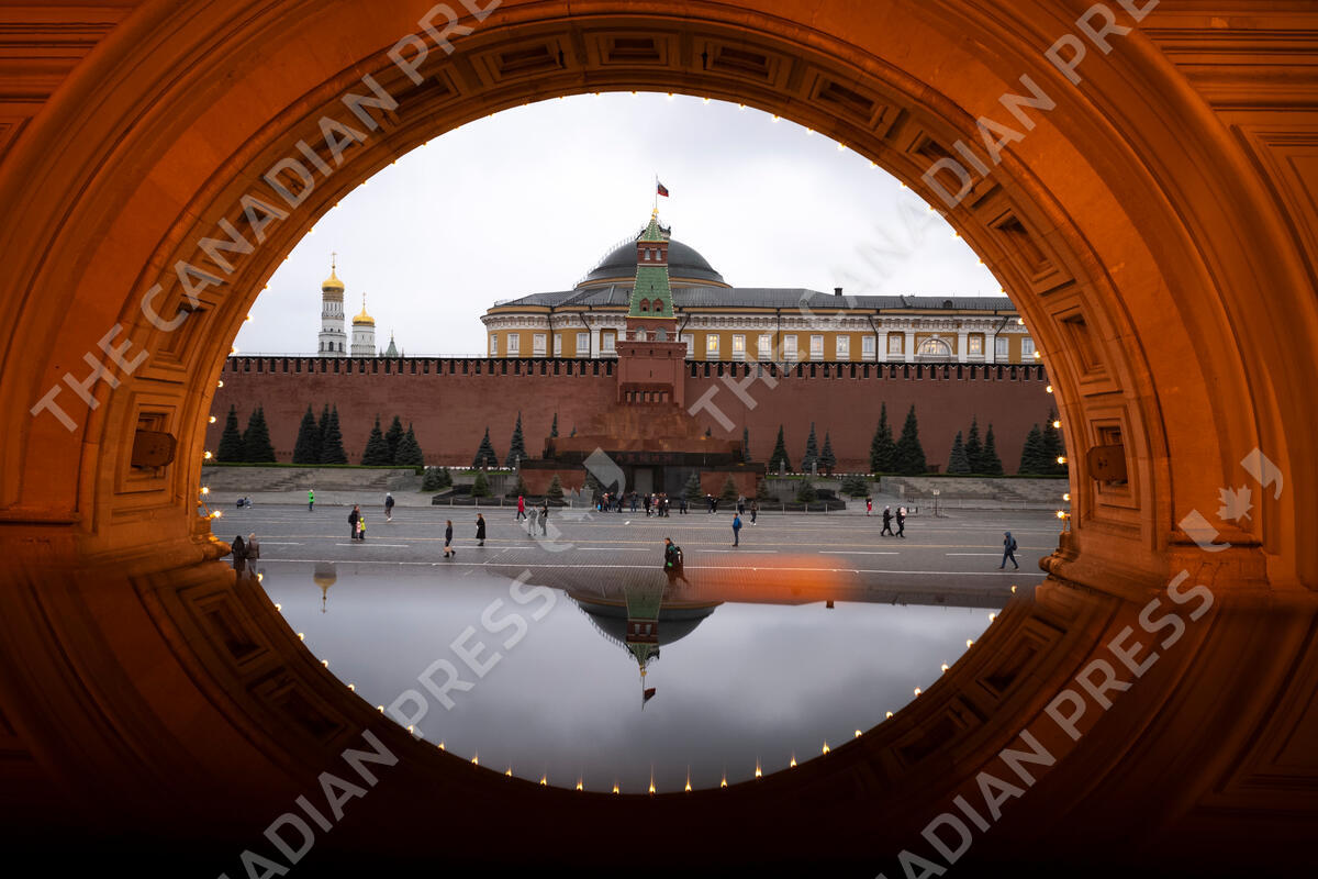 The Kremlin is reflected in a glass seen through an arch of the GUM, the State Shop in Red Square in Moscow, Russia, Wednesday, Sept. 22, 2021. (AP Photo/Alexander Zemlianichenko)