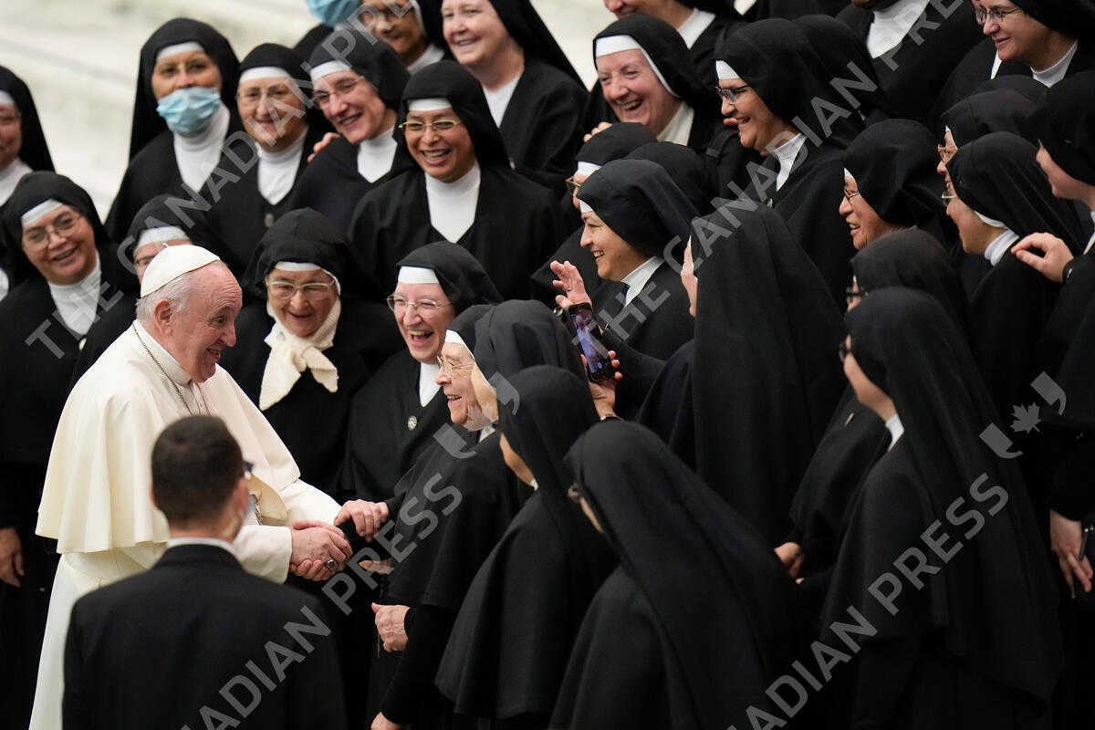 Pope Francis greets a group of nuns during his weekly general audience in the Pope Paul VI hall at the Vatican, Wednesday, Oct. 20, 2021. (AP Photo/Alessandra Tarantino)