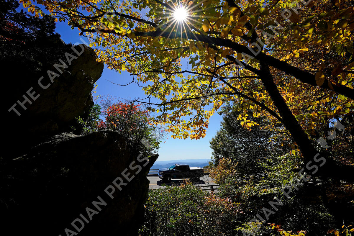 A vehicle navigates the Linn Cove Viaduct along the Blue Ridge Parkway near Linville, N.C., Monday, Oct. 18, 2021, as tourists observe the yearly display of autumn colors. (AP Photo/Gerry Broome)