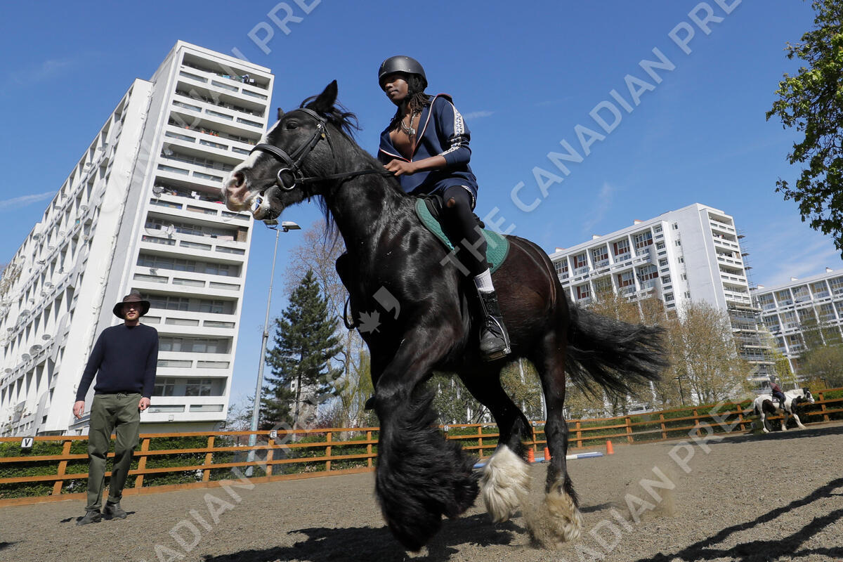 Mikhi Fearon, 17, rides Molly watched by instructor Tom Warmerdam, during a riding lesson at Ebony Horse Club in Brixton, south London, Sunday, April 18, 2021. In the midst of south London's hustle and bustle, only a 10-minute walk from a subway station, is a school where children are encouraged to horse around. The Ebony Horse Club provides 140 rides per week to children in the local community offering them the opportunity to learn important life skills along with horseback riding. (AP Photo/Kirsty Wigglesworth)