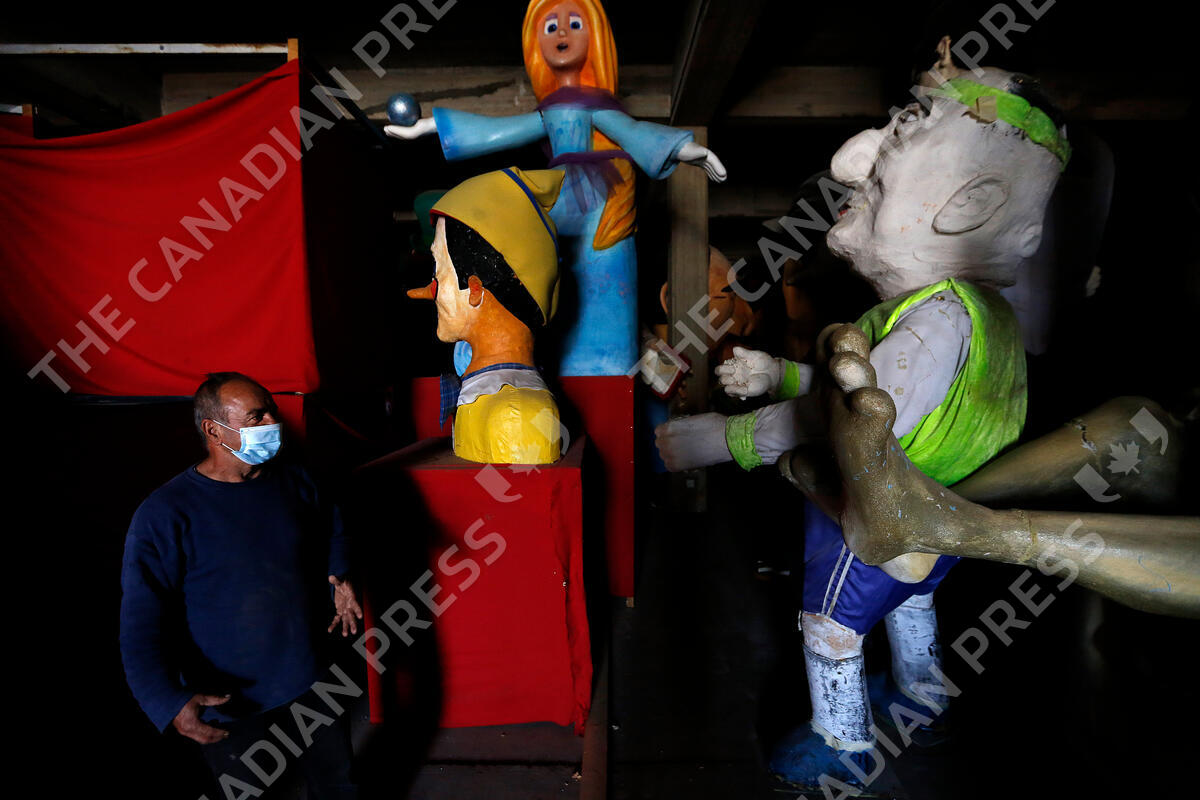 Stelios Kolonas, a worker on carnival preparations, stands next to carnival figures stored in a warehouse in the southern coastal city of Limassol, Cyprus Thursday, March 4, 2021. The coronavirus pandemic has dampened celebrations this year. But Limassol city authorities aren't letting the festive spirit completely wither away, organizing some events that comply with virus restrictions. The culmination of this is the secret outing of King Carnival, the lead float that marks the season's annual theme. (AP Photo/Petros Karadjias)