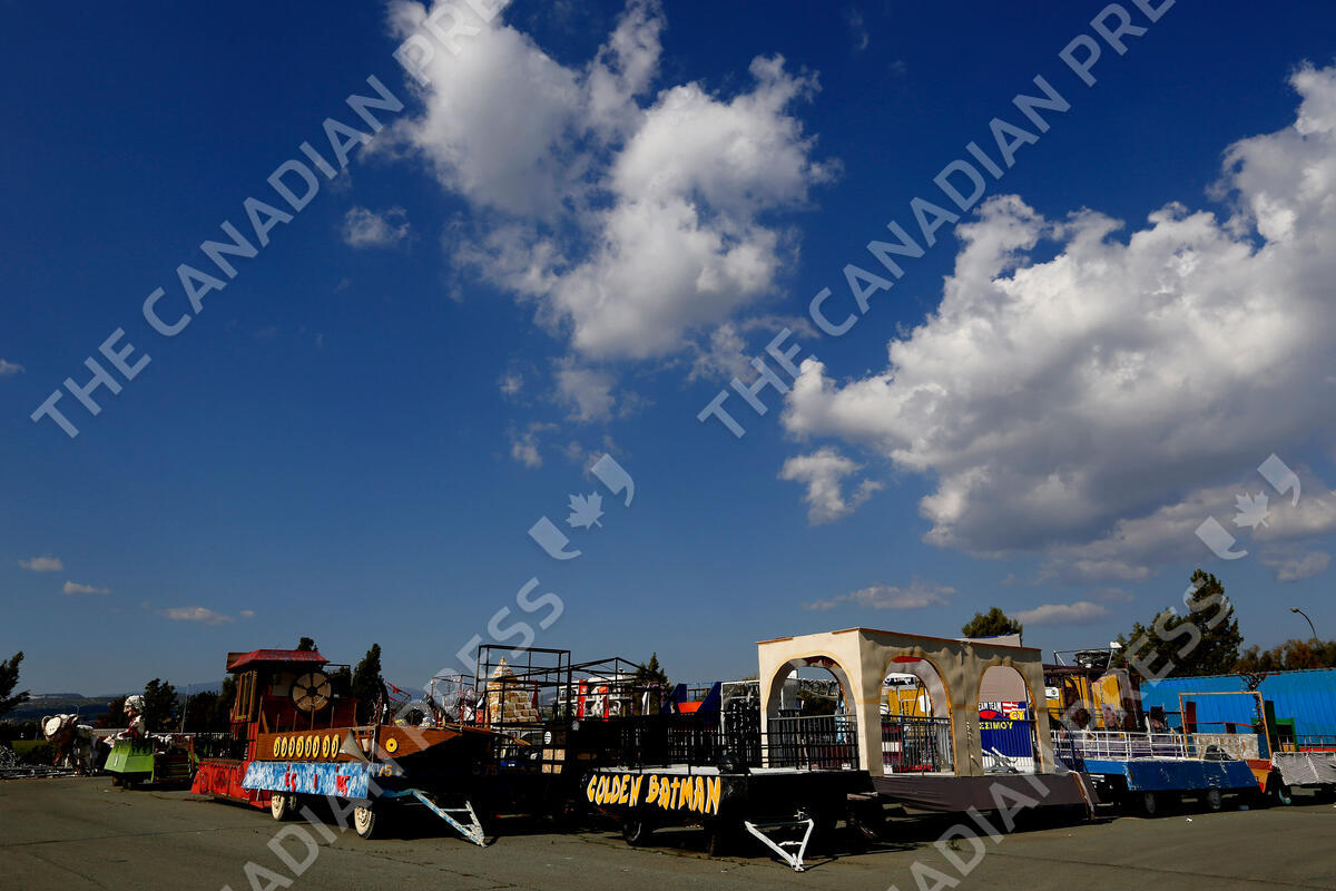 Carnival floats are parked at a warehouse in the southern coastal city of Limassol, Cyprus, Thursday, March 4, 2021. The coronavirus pandemic has dampened celebrations this year. But Limassol city authorities aren't letting the festive spirit completely wither away, organizing some events that comply with virus restrictions. The culmination of this is the secret outing of King Carnival, the lead float that marks the season's annual theme.(AP Photo/Petros Karadjias)