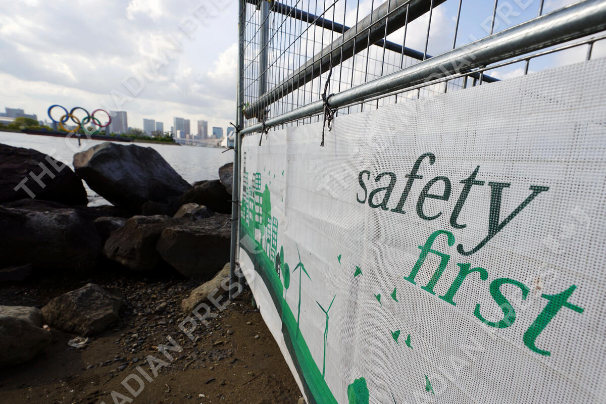 A construction fence featuring the words "Safety First" with a backdrop of the Olympic rings floating in the water in the Odaiba section Thursday, April 8, 2021, in Tokyo. The Tokyo Olympics are getting closer and things are starting to stir around the venues, though not as much as you might expect. Many preparations are still up in the air as organizers try to figure out how to hold the postponed games in the middle of a pandemic. (AP Photo/Eugene Hoshiko)