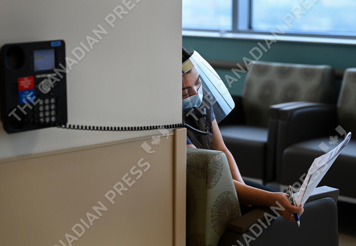 Olivia Coughlin, a registered health-care social worker, calls the family of a COVID-19 patient who's in critical condition in the intensive care unit at the Humber River Hospital during the COVID-19 pandemic in Toronto on Tuesday, April 13, 2021. THE CANADIAN PRESS/Nathan Denette