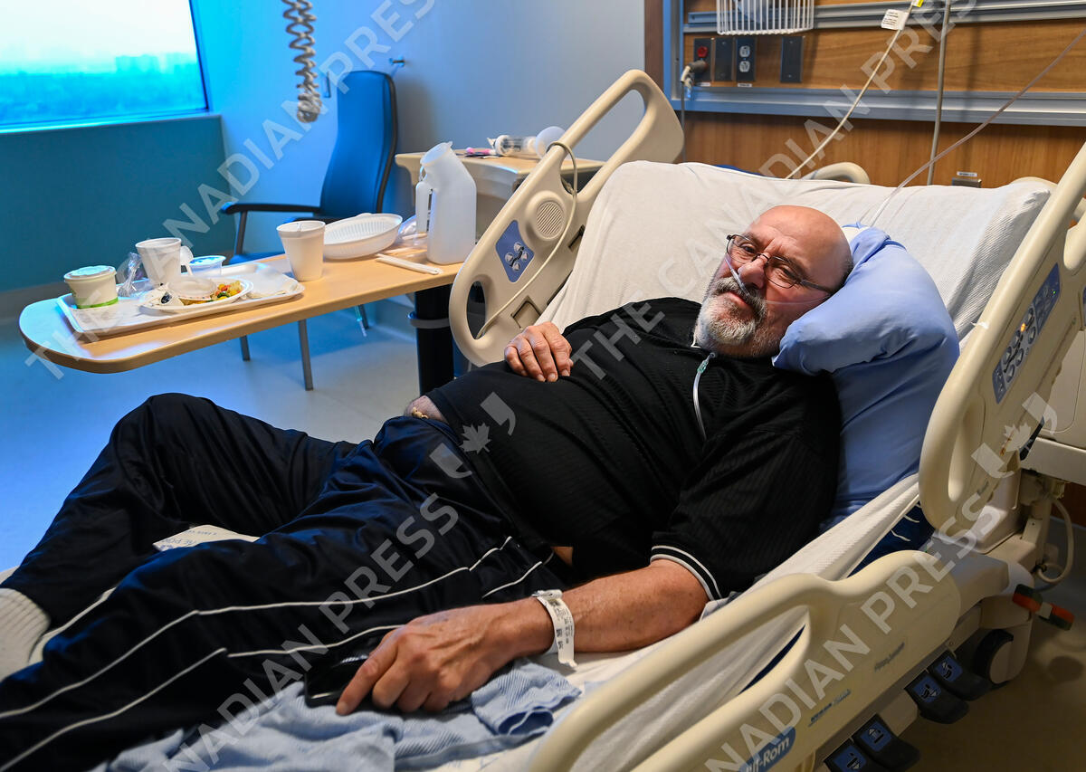 Jose Garcia, 67, receives oxygen in the respirology unit as he is battling COVID-19 at the Humber River Hospital during the COVID-19 pandemic in Toronto on Tuesday, April 13, 2021. THE CANADIAN PRESS/Nathan Denette