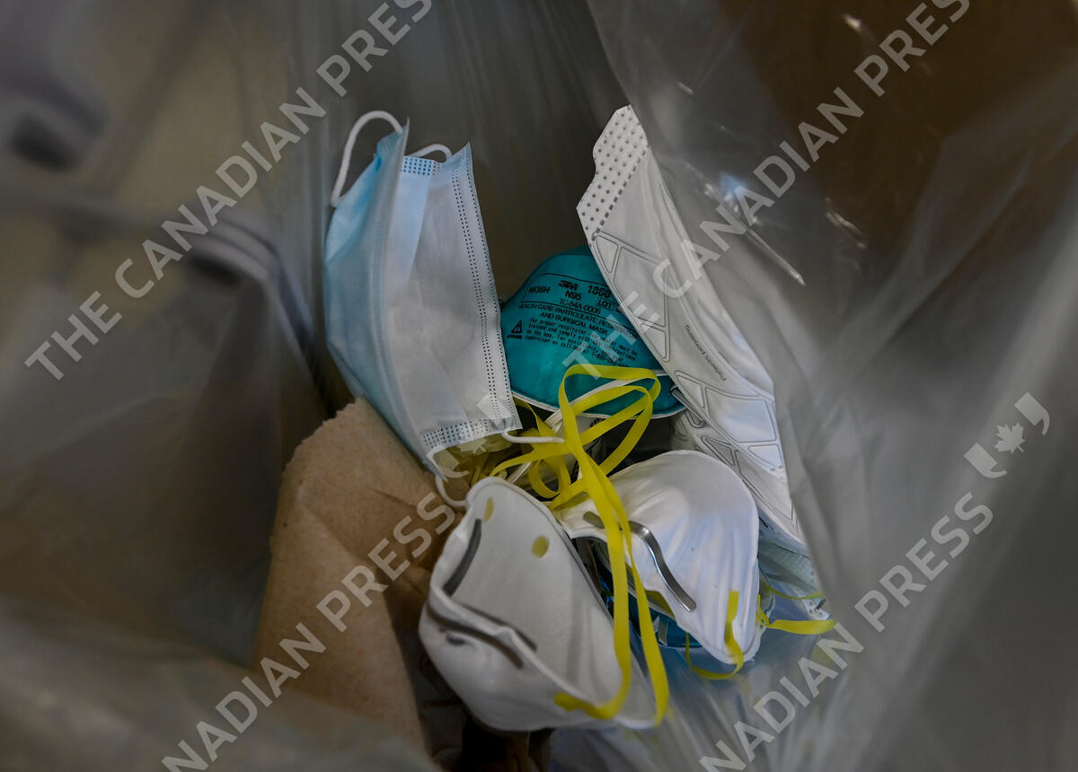Discarded personal protective masks are shown in the garbage in the intensive care unit at the Humber River Hospital during the COVID-19 pandemic in Toronto on Tuesday, April 13, 2021. THE CANADIAN PRESS/Nathan Denette