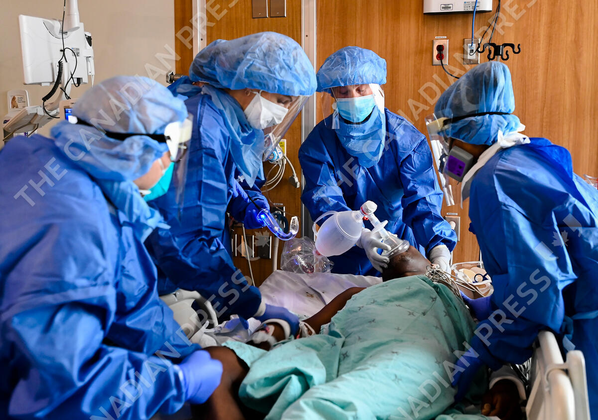 A 60-year-old COVID-19 patient fights for his life, desperately gasping for air as health-care staff provide life saving medical care in an emergency situation in the intensive care unit at the Humber River Hospital during the COVID-19 pandemic in Toronto on Tuesday, April 13, 2021. The patient was intubated and put on a ventilator successfully. THE CANADIAN PRESS/Nathan Denette