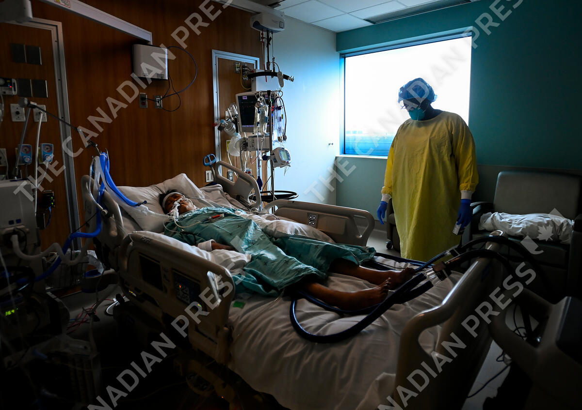 Registered nurse Jane Abas tends to a COVID-19 variant patient who is intubated and on a ventilator in the intensive care unit at the Humber River Hospital during the COVID-19 pandemic in Toronto on Tuesday, April 13, 2021. THE CANADIAN PRESS/Nathan Denette