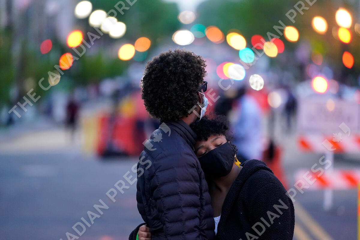 A couple dances at Black Lives Matter Plaza near the White House on Tuesday, April 20, 2021, in Washington, after the verdict in Minneapolis, in the murder trial against former Minneapolis police officer Derek Chauvin was announced. (AP Photo/Alex Brandon)