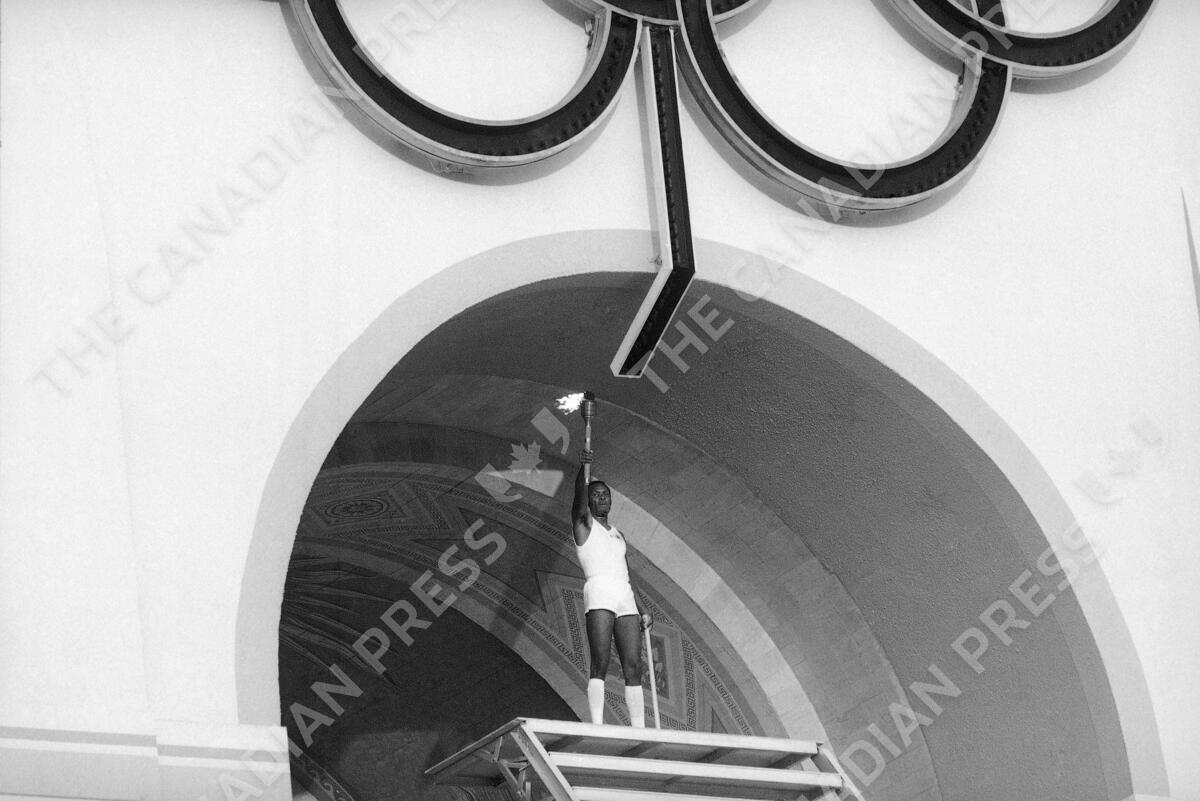 Rafer Johnson, 1960 gold medalist for the decathlon, lights the Olympic torch during the Opening Ceremonies of the 23rd Olympiad in Los Angeles in 1984. (AP Photo)