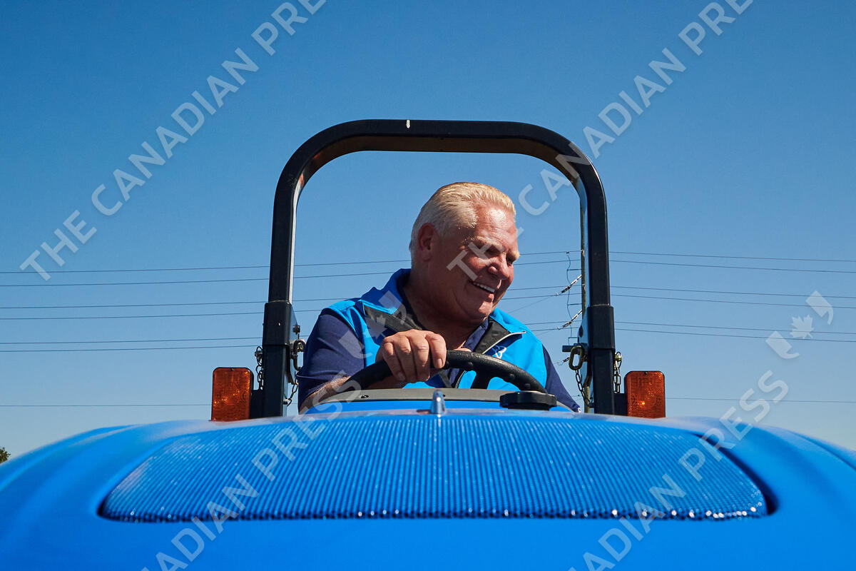 Ontario Premier Doug Ford prepares to plow a furrow with a tractor at the 2025 International Plowing Match in Grassie, Ont., on Tuesday, Sept. 16, 2025. THE CANADIAN PRESS/Sammy Kogan