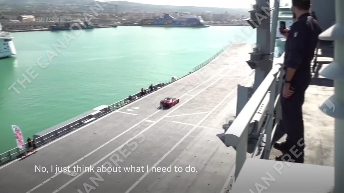 Along Italy’s central coast on Thursday, driver Fabio Barone raced across the flight deck of a navy ship while chasing a world record: the fastest car on a boat. (AP Video by Paolo Santalucia)