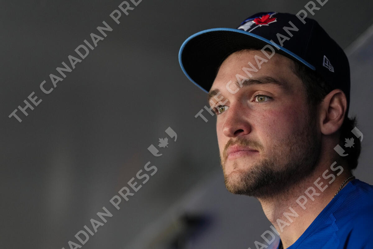 Toronto Blue Jays' Trey Yesavage talks to members of the media ahead of MLB baseball action against Baltimore Orioles in Toronto on Sunday September 14, 2025. THE CANADIAN PRESS/Chris Young