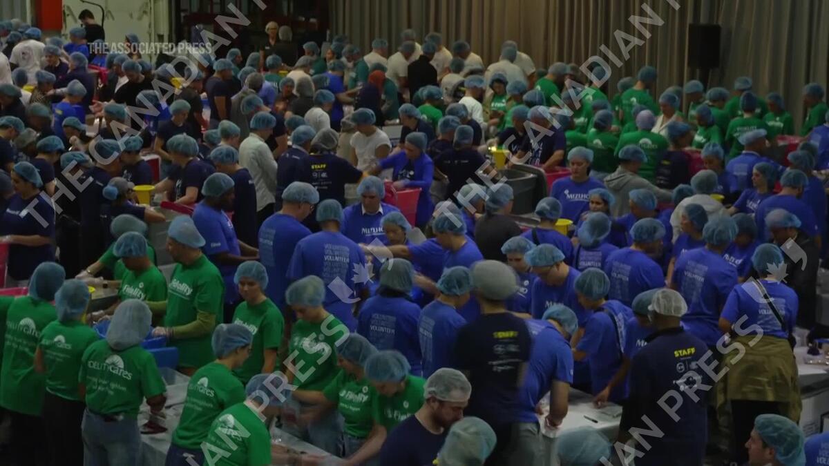 People across the country are taking part in a national day of service marking the anniversary of the Sept. 11, 2001 terror attacks. The effort kicked off Wednesday in Manhattan where thousands of volunteers began assembling more than two million meals for needy New Yorkers aboard the USS Intrepid. (Sept. 10)(AP Video: David R. Martin)